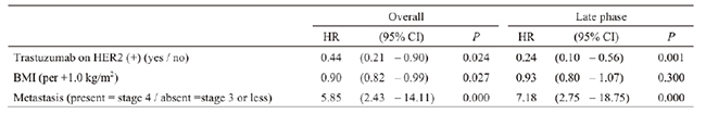 Overallは全期間、Late phaseは2007年以降を示す。AC心筋症の発症時の死亡の予測因子。遠隔転移とHER2陽性かつトラスツズマブ治療は独立した予測因子であった。一方、EF低下やNT-proBNPの上昇や心保護薬投与は予測因子ではなかった。