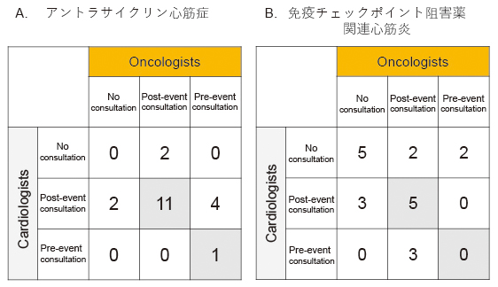 20の病院における循環器科とがん治療科間の(A)AC心筋症、(B)ICI関連心筋炎に関する相談のタイミングの一致度。科内の多数回答を科の回答として採用した。
