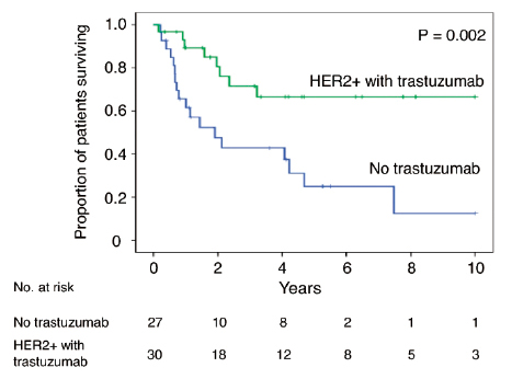 発生率が低下したにもかかわらず、AC心筋症患者は増加した(図2B)。理由の1つはAC使用患者の増加であった(図2A)。背景に乳癌診療ガイドラインによる推奨が考えられた。もう1つはAC心筋症患者の予後の改善であった。2006年以前と比べて、2007年以降は5年生存率が高かった(28% vs. 45%、p = 0.058)。ACの平均使用量は以前よりも有意に低かった(525 mg/m2 vs. 307 mg/m2、p < 0.001)。しかし、予後改善の予測因子は、ACの使用量の減少ではなく、HER2陽性でトラスツズマブ治療を受けたことであった(全死亡ハザード比 = 0.24、95%信頼区間:0.10~0.56、p = 0.001)。トラスツズマブがAC心筋症の予後を改善し、生存患者数の増加につながっていた(表1)。