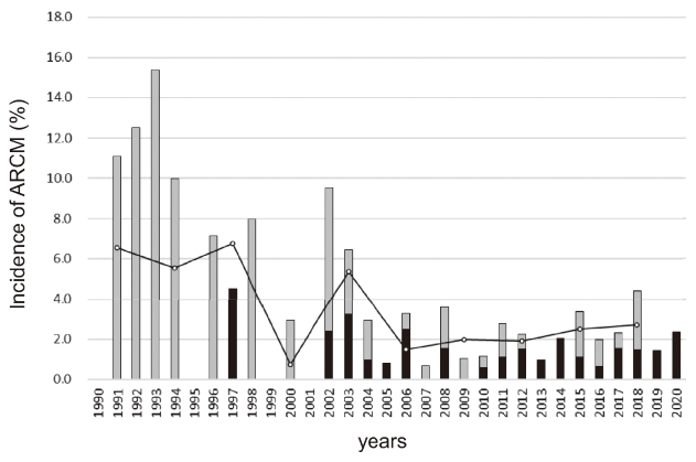 発症率は各年にAC治療を開始した患者数に対する、後にAC心筋症を発症した患者数の割合として算出した。黒色のバーはトラスツズマブ治療を受けた患者、灰色のバーはトラスツズマブ治療を受けていない患者を示す。折れ線グラフは3年ごとのARCMの発症率を示している。