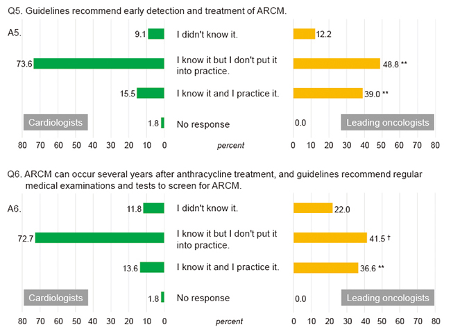 Q5)AC心筋症の早期発見と治療、Q6)遅発型慢性のAC心筋症を検出するための長期的なスクリーニング、についての質問である。回答の割合を両群間で検定した。**P < 0.01、†P < 0.001