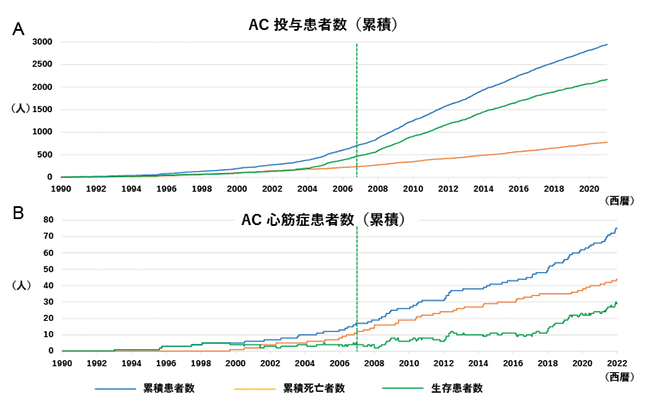 図2 AC治療を受けた乳がん患者およびAC心筋症患者の累積数