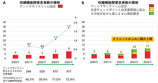 過去5年間における当院の新規収縮機能障害患者数を図7に示す。スクリーニング実施率の向上に伴い、AC心筋症の診断件数は増加傾向を示した。図7Aに示すように、スクリーニング開始前と比較すると、AC使用患者に占める割合は2.6倍(1.7%)に増加した。無症候例が多数含まれており、発症前の段階で診断できる機会が増加していることが示唆された。