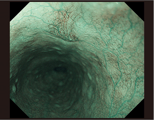 ここで気を付けて欲しいのは、brownish area様に見えるものがすべて「がん」ではないことです。菲薄化した扁平上皮や粘膜表層の剥離、炎症性変化なども限局した茶色領域に見えます。扁平上皮が限局性に菲薄化すると、上皮直下毛細血管網(subepithelial capillary network, SECN)6)と称される上皮下に存在する血管網が透見されやすくなるため、遠景でbrownish areaとして認められます(図2)。食道がんでは、上皮乳頭内血管(intra-epithelial papillary capillary loop, IPCL)の拡張、蛇行、口径不同、形状不均一の所見が認められるため7)、血管パターンの相違によって、非拡大観察でも鑑別は十分可能です。スコープの接触などによる粘膜表層の剥離は、一定の確率で起きてしまうので、食道がんリスクが高い症例の場合、挿入時よりIEEで観察して、抜去時に通常光観察を行うようにしています。以前、IEE観察が始まった頃は、brownish area様の変化を「がん」と鑑別できず、盛んに生検が行われました。最近は、内視鏡医の眼も慣れてきたので、「がん」との鑑別がある程度可能ですが、なかには紛らわしい場合もあり、IEE拡大観察での精査が必要となります。このような病変に対して、ヨード染色は有用ですが、粘膜障害作用があるため、表層部が脱落して非腫瘍性上皮が被覆し境界が不明瞭になることがあります。このため、可能な限り、ESD直前の観察まで、ヨード染色は使用しないことが望まれます。生検時の注意としては、特に小病変の場合、生検によって脱落することを考慮して、辺縁部より小さく採取することが重要です。