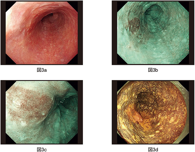 1例目は、70代男性です。毎年、紹介元の人間ドックで内視鏡検査を受けていましたが、今回、胸部中部食道に約半周性の病変を認め、生検で扁平上皮癌(SCC)と診断され紹介いただきました。嗜好歴は、喫煙歴37年、日本酒1合/毎日で、フラッシャーでした。切歯より28cmの左壁側に、わずかな発赤がみられますが、通常光観察での視認はやや困難です(図3a)。NBIでは茶色調の類円形病変の同定が容易となりますが、その周囲にも淡いbrownishな領域がみられました(図3b)。濃い茶色調を示す部分の拡大観察では、日本食道学会分類7)のType B2血管が認められ、ループ状の血管形態が崩れて蛇行する所見がみられました(図3c)。この所見から、深達度MM/SM1と診断しました。紹介元でヨード染色は行われておらず、ESD直前が初めてのヨード染色であったため、病変の境界が明瞭でした。周囲には淡染が多発して、いわゆる「まだら食道」の様相でした(図3d)。ESD後の病理診断はMt,type 0-IIc,33×21mm,SCC(mod),pT1a(M3),Ly1(D2-40),V0(EVG),pHM0,pVM0で、リンパ管侵襲陽性のため、追加の化学放射線治療を要しました。発見の1年前に紹介元で実施された内視鏡画像を見直すと、左主気管支の裏側に病変が隠れて認識ができなかった可能性が考えられました。