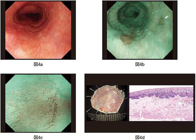 図4 食道がん症例(2例目);通常光観察(a),NBI観察(b,c),ESD検体・組織像(d)