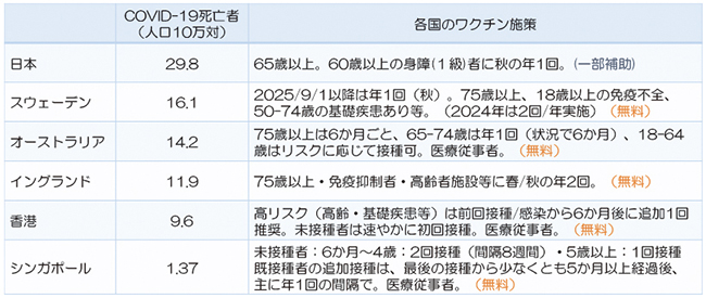 世界保健機関(WHO)では、「75歳 or 80歳以上、50歳 or 60歳以上の基礎疾患を有する方、すべての免疫不全者は6ヶ月から12ヶ月毎の接種」、「50歳 or 60歳以上の方、基礎疾患を有する方は12ヶ月毎の接種」、「妊婦は妊娠ごと」と記載されている15)。英国の18~45歳女性を対象としたコホート研究では、産・早産リスク(aHR0.74)、mRNAワクチン接種者では死産リスク(aHR0.72)の低下が有意にみられている16)。諸外国では免疫の持続が短いこと、夏と冬に流行が拡大することから、今なお無料接種が実施されている(表2)。