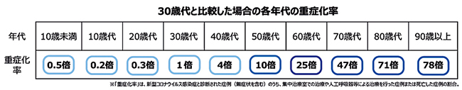 わが国でCOVID-19のオミクロン株による重症化リスクは、30代を1とすると50代は10倍、60代は25倍みられ(図2)3)、所謂ワクチンの公費助成の対象外である60歳未満でも多くの方が入院となっている(表1)4)。入院のリスクとしては高齢のほか、高血圧や高脂血症、免疫不全、肥満や喫煙、ワクチン未接種等である。