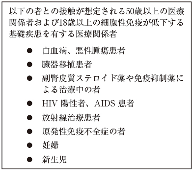 日本環境感染学会による「医療関係者のためのワクチンガイドライン」第4版10)では、表2に示すように、以下の者との接触が想定される50歳以上の医療関係者および18歳以上の細胞性免疫が低下する基礎疾患を有する医療関係者、が帯状疱疹ワクチン接種の推奨対象者であると記載されている。