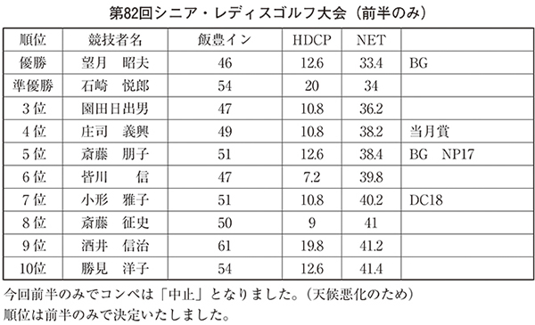 前半のプレーの終盤は“あられ”も降り、グリーンに小さな氷の粒が突然いっぱい落ちて、本来なら入るはずのパットが入らないという状況でした。さすがにこの状況では、コンペを継続することは無理でした。幹事の一存で、前半でコンペは中止とし前半のみの成績で順位を決定致しました。“コロナ禍でコンペなんかやるからだよ”と言われそうですが、感染症対策を徹底し、初めから表彰式は簡素化を予定していました。