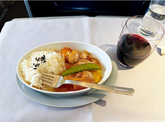 日本とデンマークの時差は7時間で、フライトはスカンジナビア航空で13時間半でした。機内食はシンプルで割とあっさりしていましたが食べやすくワインと共にいただきました(写真2)。写真の他にメインの食事があり、こちらはもっとしっかりしていました。