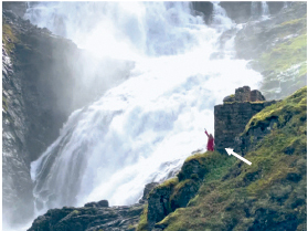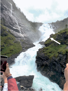 そのフロム鉄道の途中に轟々と流れ落ちる巨大な「ショース」という滝があり、そこで列車はいったん停車し滝を鑑賞しました。その滝の真ん中あたりの岩陰から赤いドレスを着た女性?が現れて音楽に合わせて何やら踊り始めました(写真15、16の矢印)。聞くところによると北欧の伝説に登場する「フルドラ」という森の精霊が観光客を歓迎しているのだそうで、機嫌の良い時にしか現れないとのことでした。ツアー仲間では「妖精はいないだろうから、役場の職員ではないか」とか「アルバイトの学生ではないか」という下世話な声もあがっていました。なおフロム鉄道は約20kmと短い路線で、乗車時間は1時間ほどでした。