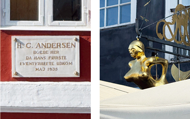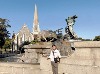 また街中の運河を囲む彩りきれいな家並みの中に(写真6)、童話作家として有名なアンデルセンが晩年に住んでいたとされるアパートがあり、その外壁にプレートが掲げられていました(写真7)。運河をはさんだその向いに、これも人魚姫とされる黄金の胸像が壁に掛けられています(写真7)。この人魚姫、前述の人魚姫の像と比べて、皆さんどう思いますか?観光としてその他にはゲフィオンの泉(写真8)などが印象的でした。