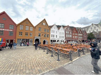 さてノルウェーのベルゲンですが、ここは14世紀のハンザ同盟で有名で、その名残の街並みを見ることができます。カラフルな家並みで遠くから見るときれいで土産屋などが軒を連ねていますが(写真9)、木造建築のためかなり老朽化しており、家が傾いたり、柱が曲がったりしていて、一部は壊れそうな感じで怖かったです。ここではガイドさんお勧めで評判のシナモンロールをいただきました(写真10)。これは美味しかったです。ベルゲンに行かれたら是非味わってみてください。
