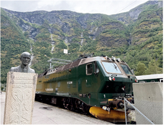 2日目の行程は、ホテルからバスで1時間のヴォスへ、そして鉄道でフロムへ、フロムから観光列車のフロム鉄道に乗車です(写真14)。列車の後ろには、そびえる山から流れ落ちる幾筋かの滝が見えます。この地域は滝がとても多いという印象を持ちました。フロム鉄道はかなり有名らいしいですが、私と家内は知りませんでした。しかし、鉄道マニアの5歳の孫は知っていました!