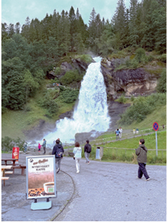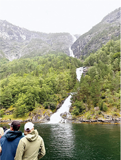 午後からは今回の旅行のメインの一つであるフィヨルドクルーズです。ノルウェーの5大フィヨルドとして、ソグネ、ハダンゲル、カイランゲル、ノール、リーゼがありますが、今回はその中でも最も名が知れ、全長が200km、氷河で削り取られた深さ1300mと世界最大のソグネフィヨルドを約2時間かけてクルーズしました。あいにく天候は曇り時々雨という状況で、真っ青な空、緑の山々、海水と淡水の入り混じった青緑の水面、というわけにはいきませんでした。しかし、今まで見たことがない急峻な山々とそれらに囲まれたフィヨルドの雄大さ(写真17)、あまたの長く大きな滝には感動しました(写真18、19)。滝は何段もあるものや山の上から流れ落ちる長いものなど多種多様でした。それらも含めて雄大さと荘厳さを十分堪能させていただきました。