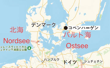 ツアーガイドさんからの話ですが、デンマークには無名、無人の島を入れると1,500ほどの島があるそうです。首都のコペンハーゲンは北海とバルト海を分ける突き出た半島部分と約400の島からなり、首都機能はシェラン島という島にあって(図)、首都機能が島にあるのは世界的にみても珍しいとのことでした。なお、コペンハーゲンの人口は約80万人で新潟市とほぼ同じ規模となります。