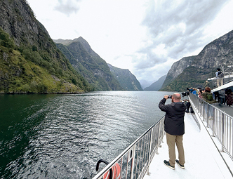 朝はノルウェーの作曲家グリークの「ペールギュント」を聞きながらフィヨルドを眺めました(写真13)。光景と曲が絶妙にマッチし、このような景色を眺めながら曲作りをしたのかな、などと勝手に想いを巡らしました。家内も同様に感じたようです。