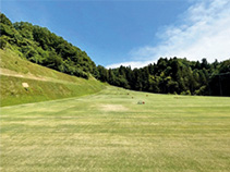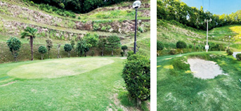 ③駐車場を挟んで反対側に、天然芝のアプローチ・バンカー練習場(写真2,3)があり、空いていれば自由に利用出来ます(無料)。