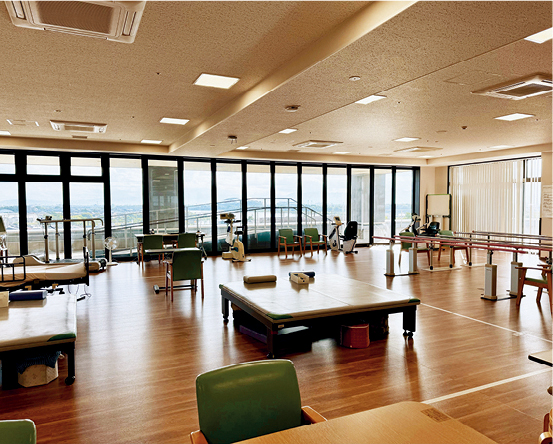 50余名の療法士が勤めるリハビリ部は、失われた機能の回復のために高密度のリハビリを行っています。土日祝日年末年始を含む毎日、1日最大3時間のリハビリを提供します。入院早期からリハビリを開始し、急性心不全で酸素投与中であっても病状が許せば入院翌日から介入します。